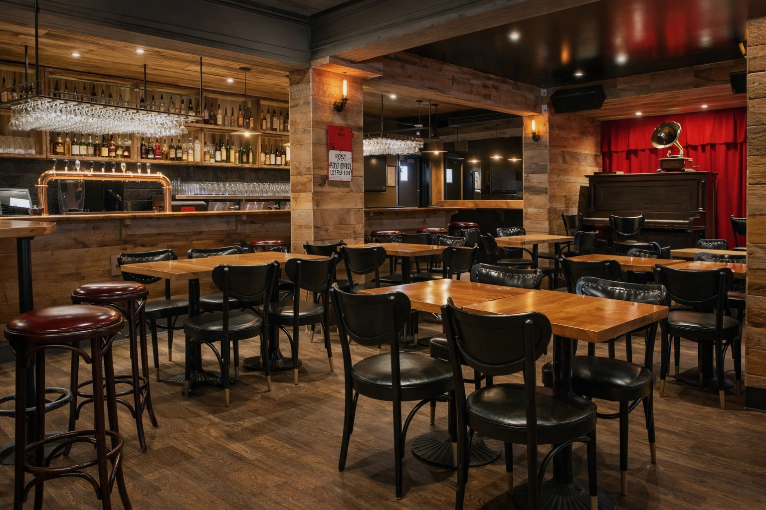 L’ambiance repose sur des contrastes marqués : matériaux sombres, éclairage scénographique et détails soignés qui renforcent le caractère distinctif du lieu.